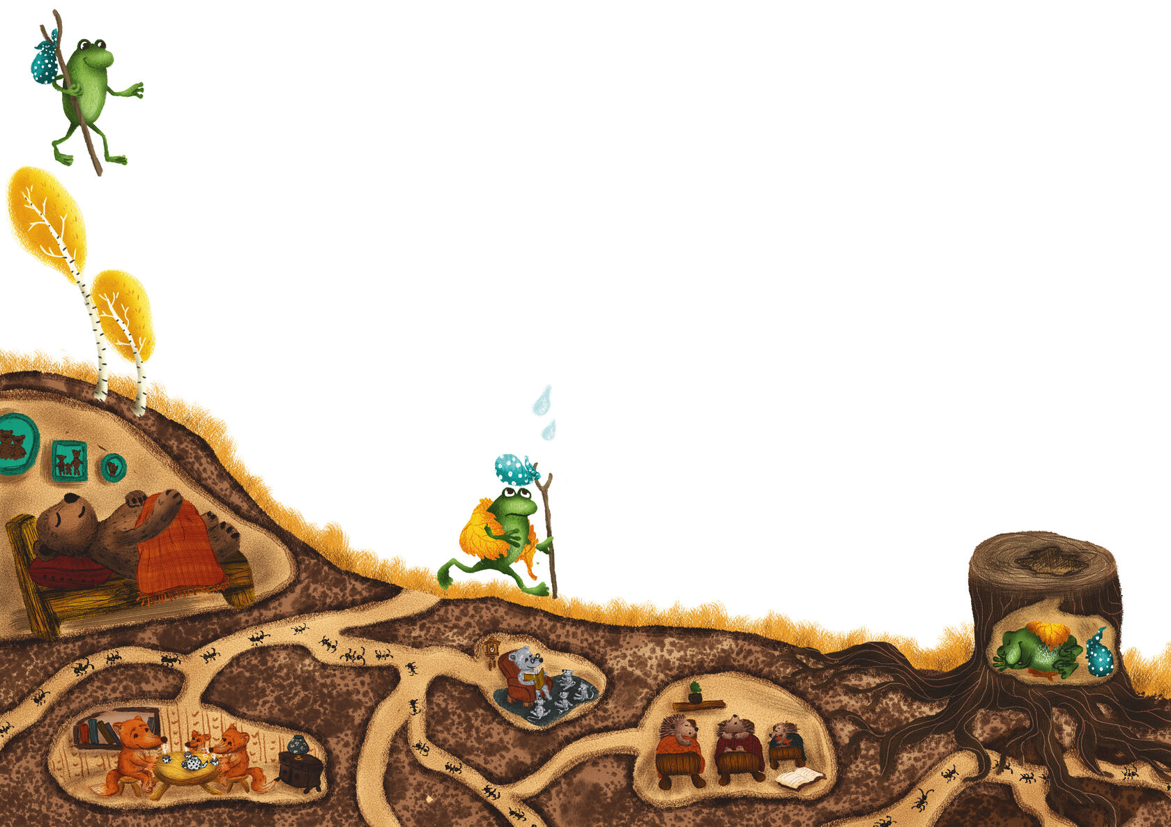 Осенью в наши края приходят не только яркие краски, но и суровые холода. Ты, конечно же, сможешь спрятаться в тёплом доме и как следует выспаться после прогулки. Но что же делать животным? Ведь им, как и тебе, может быть холодно, но они до сих пор не строят кирпичные дома. Куда же они тогда прячутся, как греются и где переживают долгие зимние времена? Давай вместе разберёмся. Как ты знаешь, у многих животных есть толстый подшёрсток, похожий на шубу. Благодаря ему животные не замерзают в холода. Но как быть, например земноводным: лягушкам, тритонам, диким ящеркам? Ведь у них нет никакой шерсти, а значит, они непременно замёрзнут осенью и зимой.